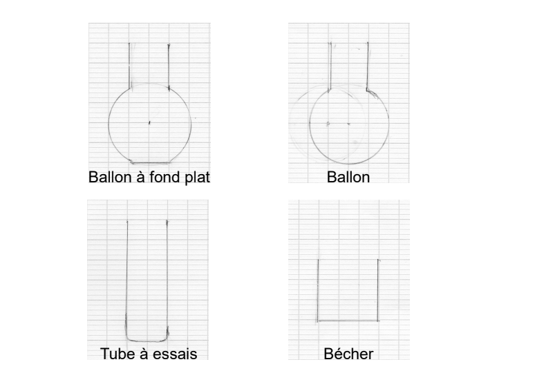 Voici les schémas des différents récipients en verre que vous devez recopier en respectant le nombre de carreaux sur votre feuille de cours.