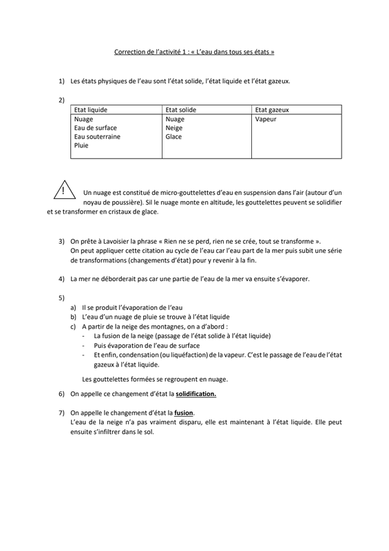 Je vous dépose les corrections du QCM (page 2) et de l'activité 1 "L'eau dans tous ses états". Je vous demande de les noter sur votre classeur.